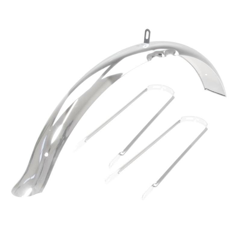 Univerzálna sada predného a zadného oceľového 26" blatníka so vzperami, určená na bicykle typu cruiser, chopper. Použitý materiál s chrómovaným povrchom garantuje vysokú odolnosť a dlhú životnosť.