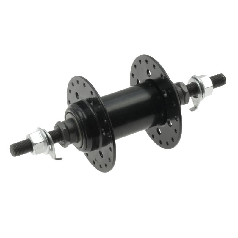 Oceľový náboj čiernej farby pre predné koleso s 36 dierami pre špice (drôty) výpletu.