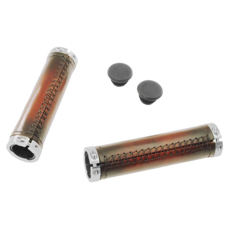 Luxusné kožené rukoväte Manopole od talianskeho výrobcu Monte Grappa. Gripy čierno-hnedej farby sú vybavené hliníkovými lock-on objímkami, ktoré dotvárajú elegantný vzhľad a hlavne zabránia pretáčaniu rukovätí na riadidlách bicykla.